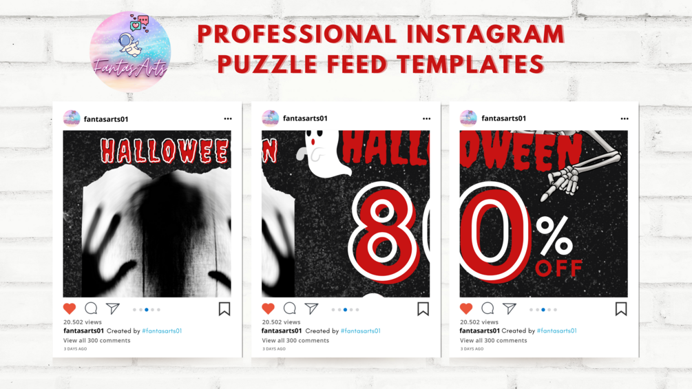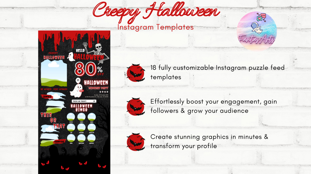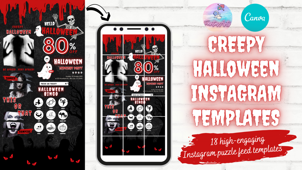 🌟 This Creepy Halloween editable Instagram puzzle feed template includes nearly a month's worth of social media content. A nice, clean, and cohesive social media feed will help you build trust with your audience, and catch their interest in your business. And by being consistent and showing up every day, you will eventually turn your loyal followers into your paying customers.
