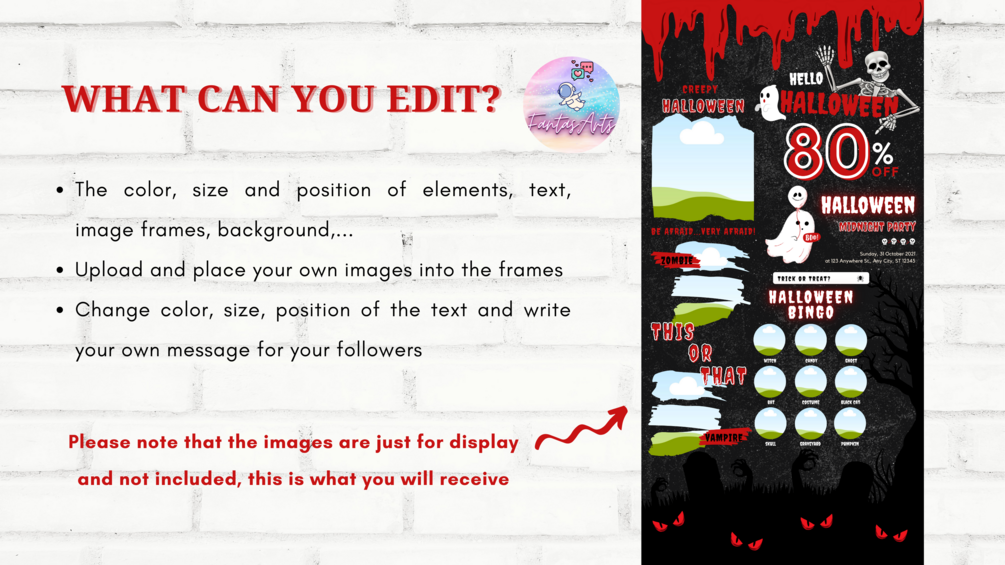 🌟 This Creepy Halloween editable Instagram puzzle feed template includes nearly a month's worth of social media content. A nice, clean, and cohesive social media feed will help you build trust with your audience, and catch their interest in your business. And by being consistent and showing up every day, you will eventually turn your loyal followers into your paying customers.