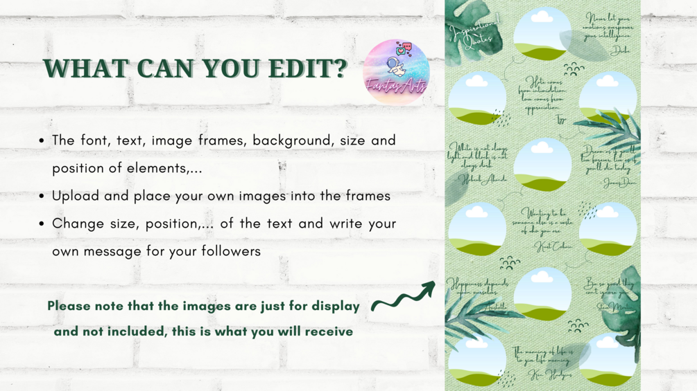 ☾ All templates are fully designed in Canva WITHOUT graphic design experience. All you need to do is basic Canva knowledge. You can just drag & drop your image, change the font, or change the word as easy as pie.